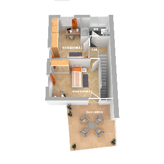 Das Obergeschoss beeindruckt mit einem tollen Badezimmer in harmonischen blau-weiß Tönen, ausgestattet mit hochwertigen Sanitärobjekten der Marke Bette. Besondere Highlights sind die großzügige Eckdusche mit Glaswand und die komfortable Eckbadewanne. Der hochwertige Korkboden in allen Räumen sorgt für ein angenehmes Raumklima. Das Schlafzimmer verfügt über einen begehbaren Kleiderschrank mit eleganten Echtglas-Schiebetüren in warmem Gelb.
